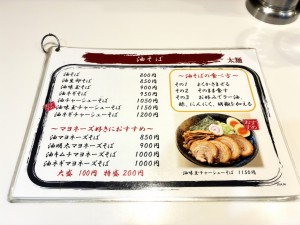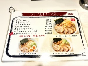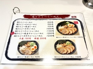 麺のメニューは塩とんこつらーめん・煮干しらーめん・つけめん・油そばをベースに、もやし・ネギ・味玉・チャーシューなどのトッピングによるバリエーション、この他にご飯ものやおつまみなどのサイドメニューの構成。