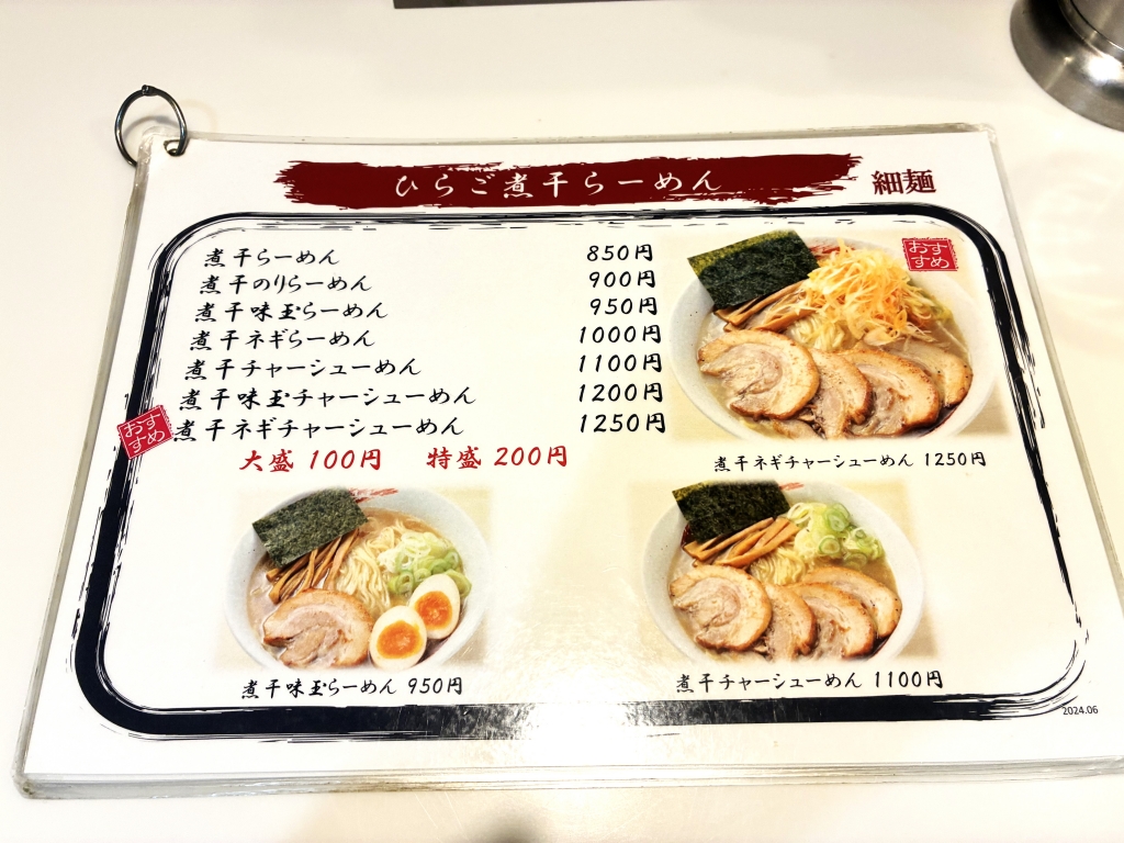 今回はお店おすすめの1つ、『ひらご煮干しらーめん』をチョイス。オーダーから10分ほどでらーめんが到着。